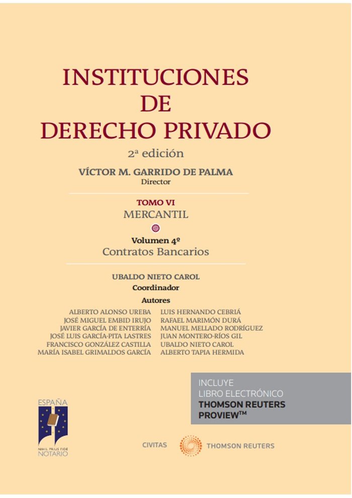 Dentro de esta gran obra de INSTITUCIONES DE DERECHO PRIVADO y, concretamente, dentro de su Tomo VI de Derecho Mercantil, no podía faltar un volumen dedicado especialmente a los contratos bancarios. Es innecesario destacar la importancia económica que tienen las entidades bancarias en la financiación y gestión de los fondos de familias, empresas y administraciones públicas, lo que siempre se plasma en contratos. La trascendencia jurídica de esta contratación es también es innegable, no solo por su importancia cuantitativa, sino también porque difícilmente en la vida de las personas y las empresas no se hace necesario en algún momento un contrato bancario. Entre estos destacan los de financiación en los que el notariado tiene una intervención más destacada. En efecto, sin perjuicio del principio de libertad de forma que rige tanto en el ámbito de la contratación civil como en la mercantil, la instrumentación de estos contratos en documentos públicos autorizados o intervenidos por Notario es no sólo frecuente sino, en muchos casos, necesaria, como ocurre con los contratos de crédito inmobiliario. Sin perjuicio del debido asesoramiento a la parte adherente con el que pretende equilibrar la asimetría de información en la que se encuentra el cliente frente a la entidad de crédito, está el control de legalidad que realiza el Notario, quedando asegurado así el cumplimiento de las normas tuitivas aplicables a los contratos bancarios y, muy especialmente, las referentes a su transparencia. Tampoco hay que olvidar la ventaja que obtiene la entidad de crédito de la intervención notarial habida cuenta que el documento público es también título ejecutivo por lo que dota a su crédito de una mayor eficacia jurídica a la hora de reclamar las cantidades impagadas.